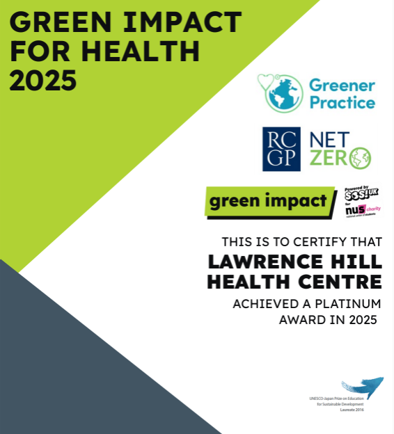 🌍✨ We’re thrilled to announce that Lawrence Hill Health Centre has been awarded the Platinum Award for Green Impact!
